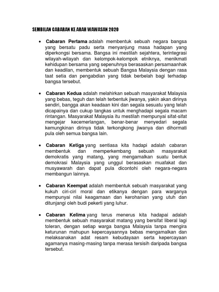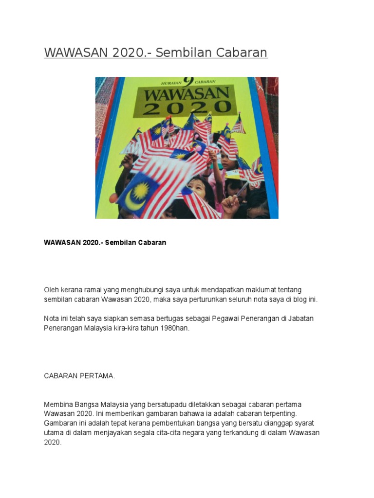 Cabaran pertama wawasan 2020. Sembilan cabaran wawasan 2020. Wawasan 2020 ialah sebuah wawasan kerajaan yang pada pada 1991. Cetusan idea adalah daripada tun dr mahathir pada tampuk pentadbiran beliau yang pertama sebagai perdana menteri.