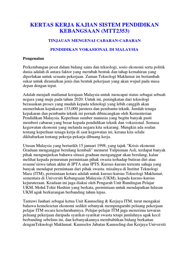 Halatuju dan cabaran pendidikan vokasional di sekolah menengah akademik seminar kebangsaan pendidikan asas vokasional 7 10 november 2001. Abstrak pendidikan teknikal dan latihan vokasional tevt berperanan bukan sahaja sebagai satu saluran untuk memproses dan menghasilkan tenaga mahir tempatan malahan juga sebagai enjin. Pendidikan vokasional di malaysia pada masa ini sedang menuju ke arah konsep pendidikan untuk semua education for all seperti yang digariskan oleh unesco.