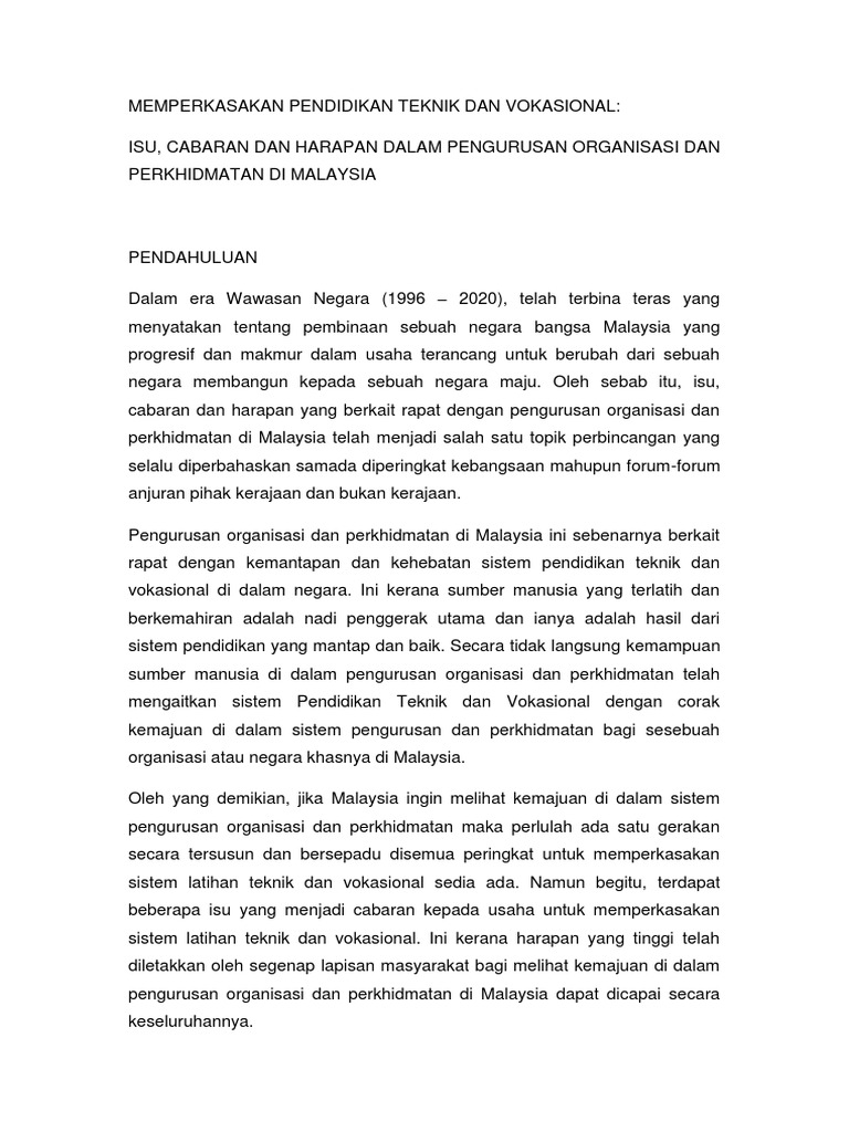 Memperkasakan pendidikan teknik dan vokasional. Cabaran dan strategi pendidikan teknik dan vokasional ke arah mencapai wawasan 2020 pdf. Isu cabaran dan harapan dalam pengurusan organisasi dan perkhidmatan di malaysia pendahuluan dalam era wawasan negara 1996 2020 telah terbina teras yang menyatakan tentang pembinaan sebuah negara bangsa malaysia yang progresif dan makmur dalam usaha terancang untuk berubah dari sebuah negara membangun kepada sebuah negara maju.
