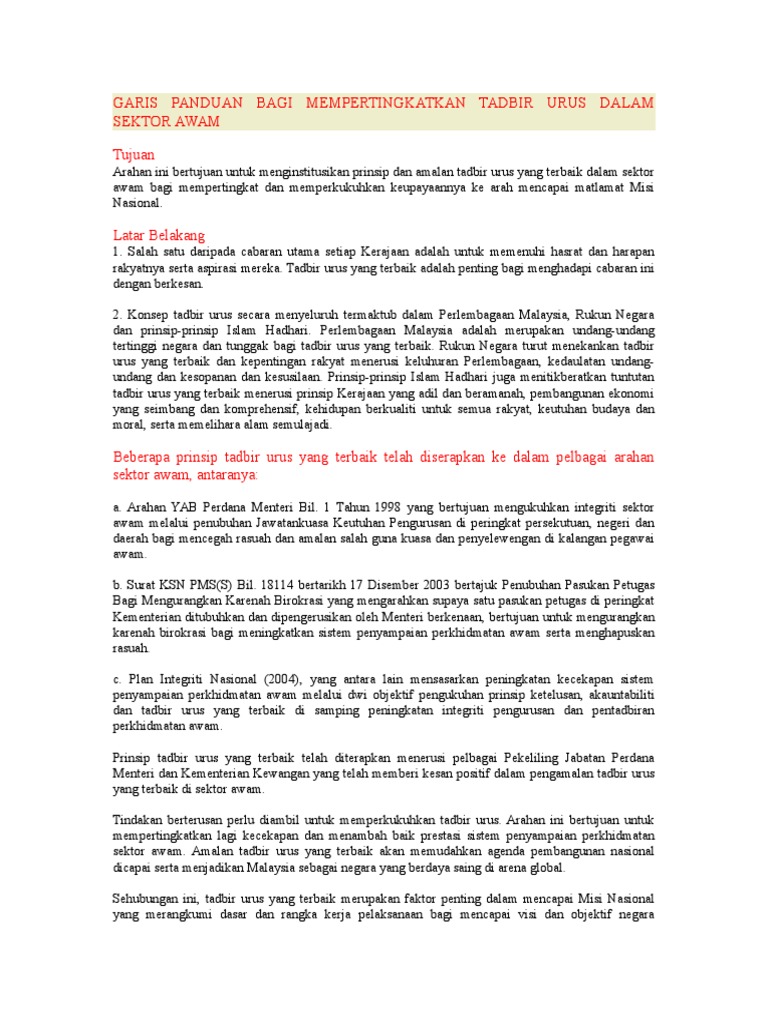 Garis Panduan Bagi Mempertingkatkan Tadbir Urus Dalam Sektor Awam Tujuan