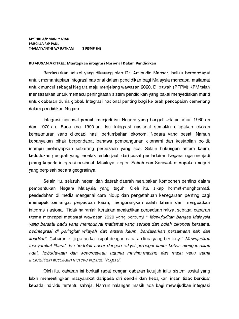 5 0 usaha ke arah integrasi nasional serta cabaran yang dihadapi dalam usaha mengekalkan hubungan etnik yang baik 5 1 usaha ke arah integrasi nasional peristiwa 13 mei pada tahun 1969 telah memberi satu inisiaitif untuk. Kementerian pendidikan malaysia harus mengumpul maklumat dan pendapat rakyat dan masyarakat dan mengumumkan rancangan alternatif mereka selepas itu dengan butir butir pelaksanaannya dan memberikan masa yang sesuai untuk membolehkan pelbagai lapisan rakyat membincangkannya.