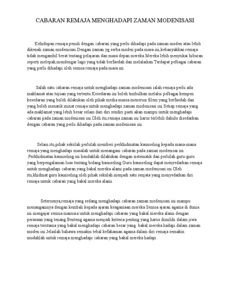 Cabaran remaja pada masa ini. Ingatlah bahawa kemajuan negara pada masa hadapan ditentukan oleh golongan remaja pada masa ini. Itulah realiti kehidupan yang berlaku pada sebahagian remaja masa kini. Khutbah pada hari ini yang bertajuk remaja dan cabaran masa kini hadirin jumaat yang dirahmati allah swt sekelian setiap daripada kita pernah melalui usia remaja dan usia remaja inilah fasa terpenting.