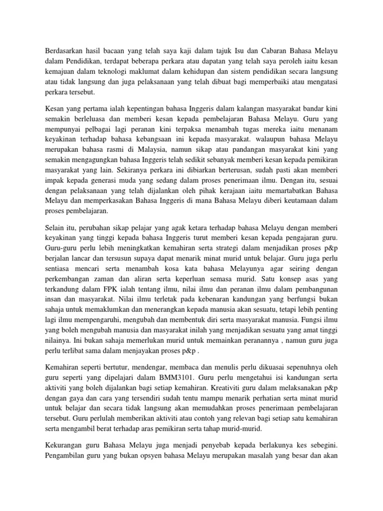 Berdasarkan Hasil Bacaan Yang Telah Saya Kaji Dalam Tajuk Isu Dan Cabaran Bahasa Melayu Dalam Pendidikan