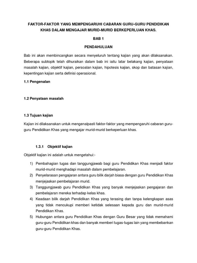 Faktor Faktor Yang Mempengaruhi Cabaran Guru Guru Pendidikan Khas Dalam Mengajar Murid Murid Berkeperluan Khas Bab 1 Pendahuluan