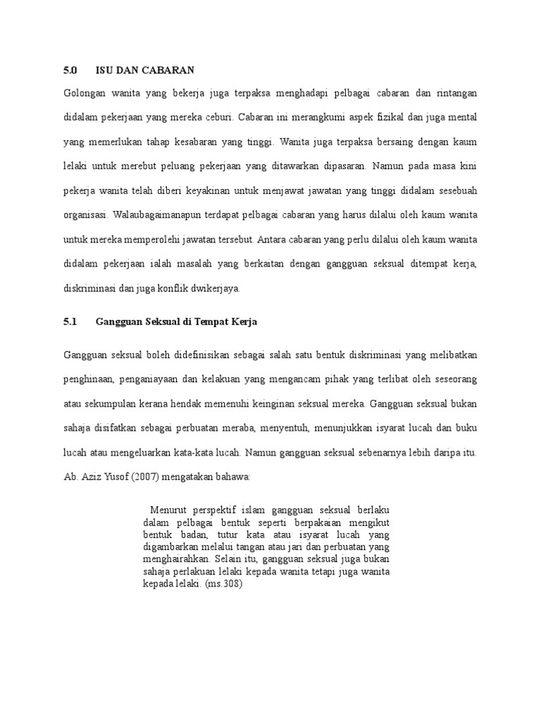 Wanita bekerja khususnya harus mempertimbangkan kesan mempunyai anak terhadap kerjaya mereka. Sesungguhnya orang orang lelaki yang islam serta orang orang perempuan yang islam. 0 isu dan cabaran golongan wanita yang bekerja juga terpaksa menghadapi pelbagai cabaran dan rintangan didalam pekerjaan yang mereka ceburi.